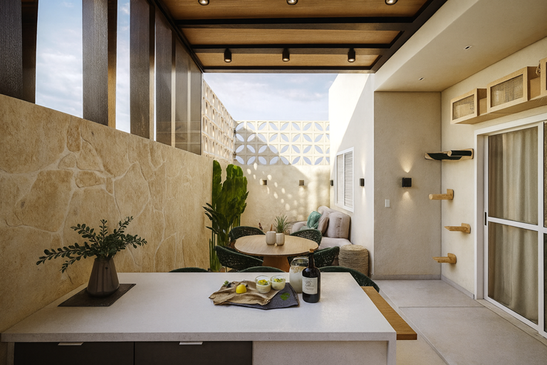 A materialidade desempenha papel central na construção da identidade do projeto. A presença da pedra moledo, da madeira e da telinha indiana introduz textura e naturalidade aos espaços, reforçando a sensação de conexão com elementos naturais e trazendo equilíbrio visual à composição.